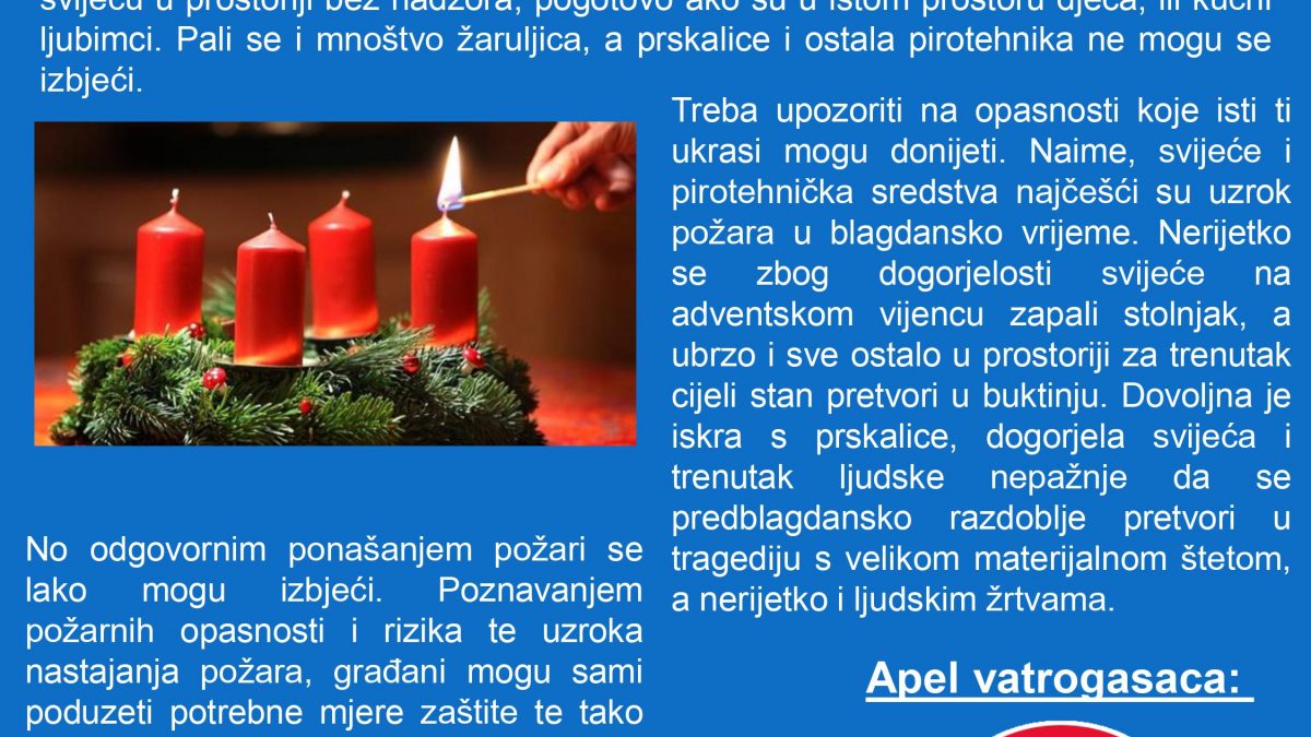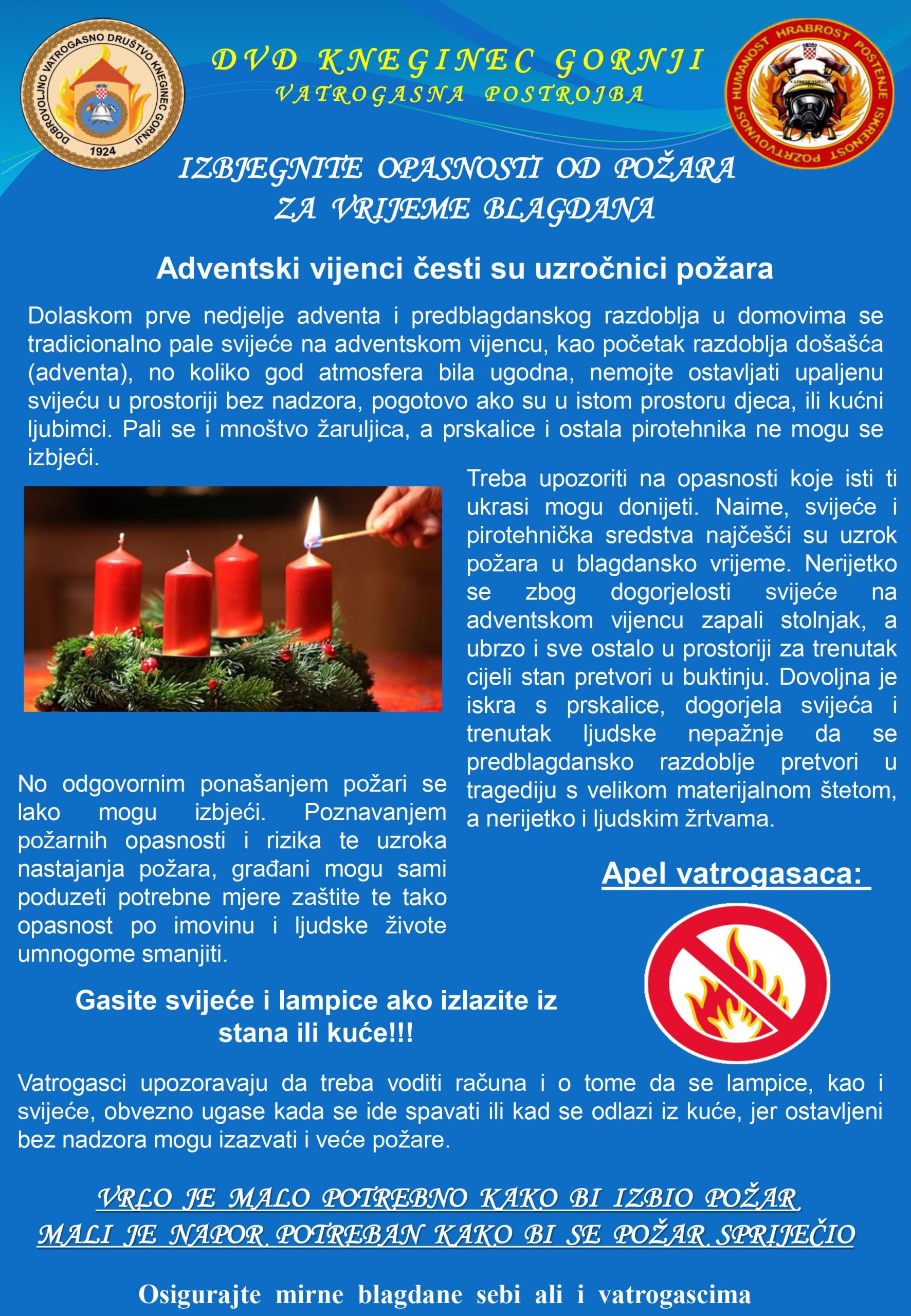 Poštovani sumještani Općine Gornji Kneginec,dolaskom adventa pale se i prve svijeće na adventskom vijencu te se povećava mogućnost izbijanja požara. Obratite pozornost na preventivne radnje.
