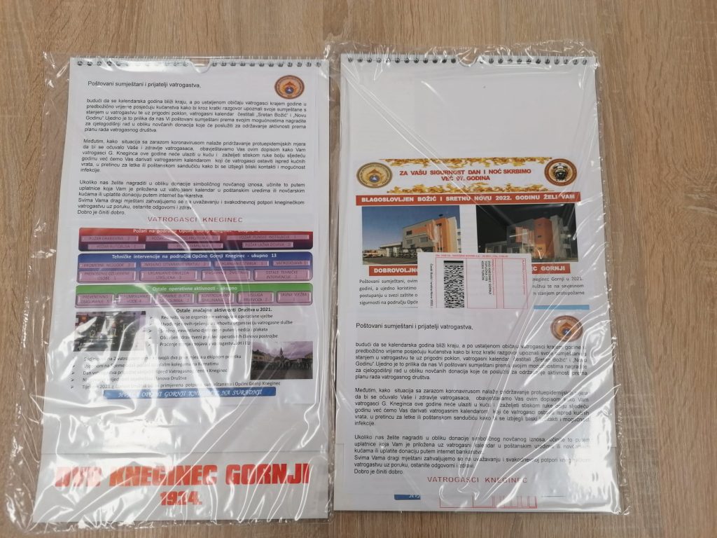Distribucija kalendara i izvješća o radu društva izvršit će se sutra 19.12.2021. godine u periodu od 09:00 do 11:00 sati.Ukoliko nas želite nagraditi u obliku donacije simboličnog novčanog iznosa, učinite to putem uplatnice koja Vam je priložena uz vatrogasni kalendar u poštanskim uredima ili novčarskim kućama ili uplatite donaciju putem internet bankarstva ili svoj dobrovoljni prilog možete osobno donijeti u vatrogasni centar Kneginec svaku nedjelju u periodu od 09:00 do 11:00 sati.