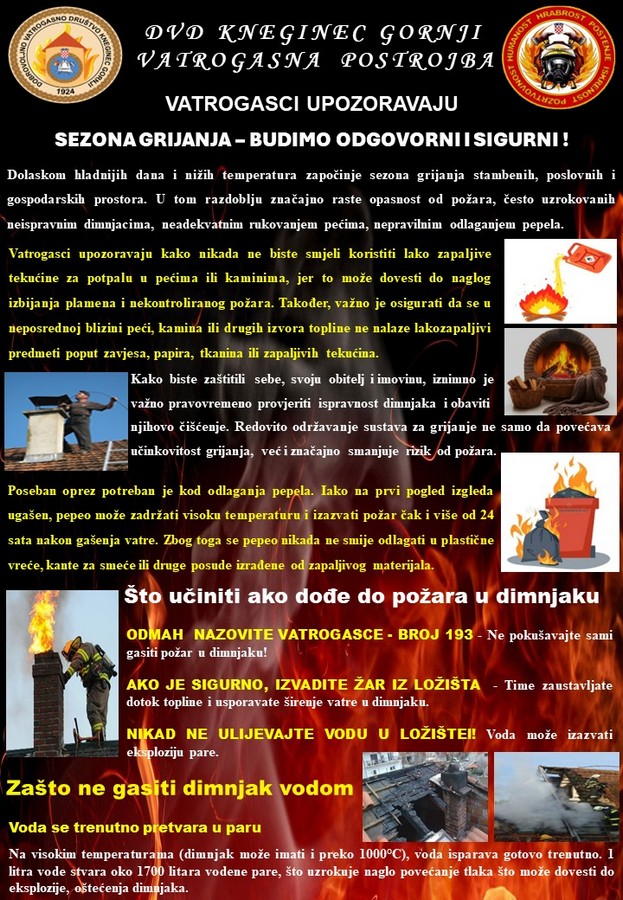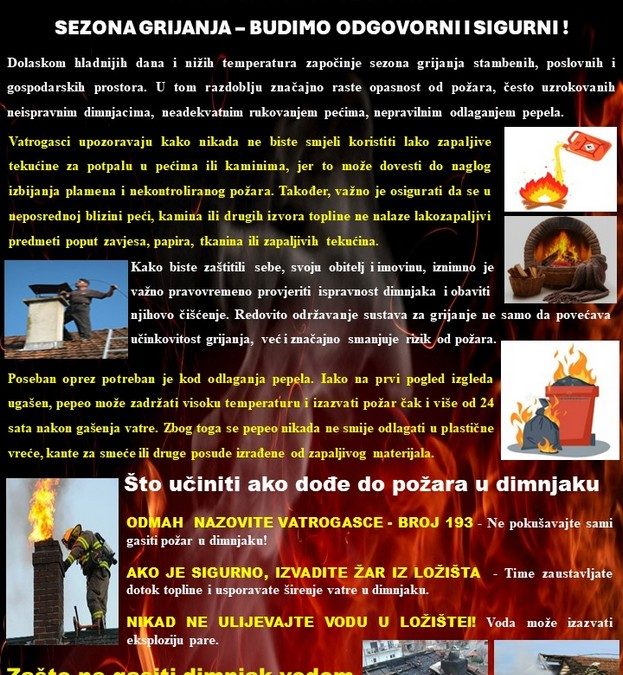 Kako opreza nikad nije dovoljno, posebnu pažnju potrebno je posvetiti preventivnim mjerama tijekom sezone grijanja. Stiglo je hladnije vrijeme i sezona grijanja je krenula. S njom, nažalost, dolaze i rizici kojih često nismo svjesni – požari i trovanja ugljičnim monoksidom.