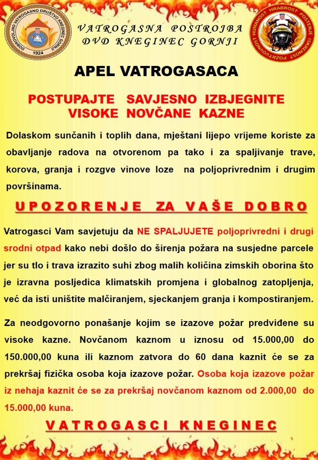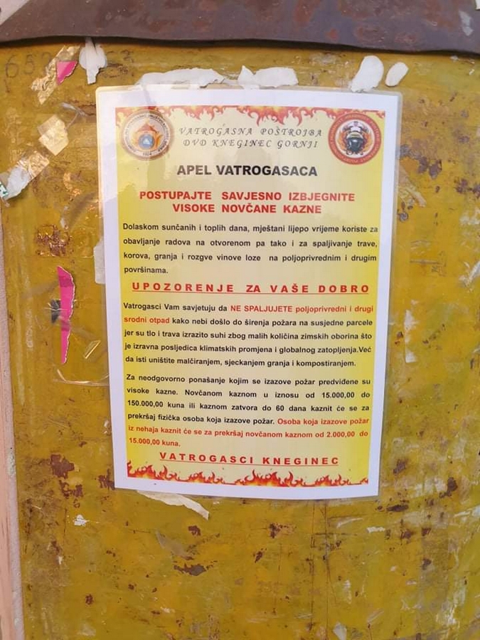 Danas 10. ožujka 2021. godine izvršili smo postavljanje plastificiranih plakata osmišljenih od strane Zapovjedništva društva s jasnom porukom sumještanima NE SPALJUJTE poljoprivredni i drugi srodni otpad..Rečene plakate, njih 25 postavili smo na oglasne ploče koje se nalaze u naseljima Gornjeg Kneginca, Donjeg Kneginca, Turčina, Varaždinbrega, Dugog i Malog vrha s namjerom da spriječimo nastajanje požara.