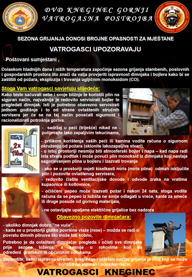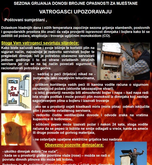 Lagano je započela sezona grijanja, nije loše ponoviti. Dimnjake, peći, bojlere, plinske i električne potrebno je redovito čistiti, servisirati i držati ispravnima. Ako se dobro djeluje preventivno manje će se djelovati operativno.