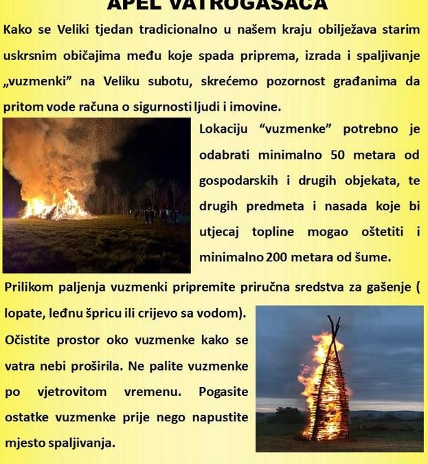 Prilikom spaljivanja vuzmenki skrećemo pozornost sumještanima na povećanu opasnost od izbijanja požara na gospodarskim objektima i požara na otvorenom prostoru uslijed neopreznog spaljivanja.